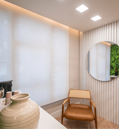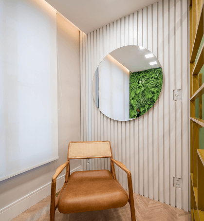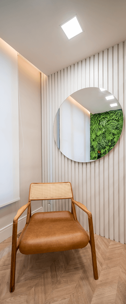 A paleta de verdes, madeiras e tons naturais foi inspirada nos princípios da biofilia e da neuroarquitetura, criando uma atmosfera que reduz o estresse, estabiliza a percepção emocional e aumenta a sensação de bem-estar. A presença de formas curvas, texturas quentes e iluminação suave ajuda a quebrar a rigidez do ambiente médico, trazendo mais humanidade e sofisticação.