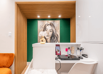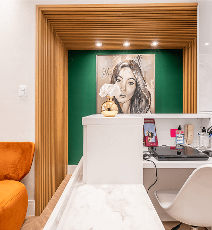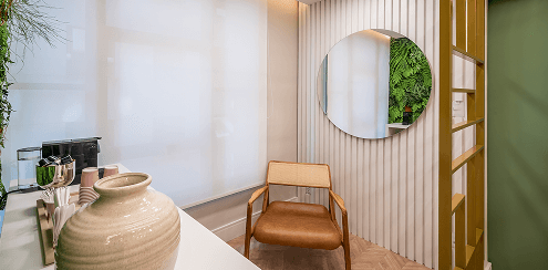 A paleta de verdes, madeiras e tons naturais foi inspirada nos princípios da biofilia e da neuroarquitetura, criando uma atmosfera que reduz o estresse, estabiliza a percepção emocional e aumenta a sensação de bem-estar. A presença de formas curvas, texturas quentes e iluminação suave ajuda a quebrar a rigidez do ambiente médico, trazendo mais humanidade e sofisticação.