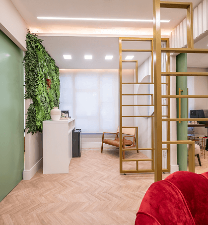 A CasaQuadrada desenvolveu um projeto que integra arquitetura, identidade e experiência do paciente. A marcenaria sob medida, os painéis ripados, os jardins verticais e os papéis de parede botânicos foram usados de forma estratégica para criar camadas de acolhimento sem comprometer a funcionalidade clínica.